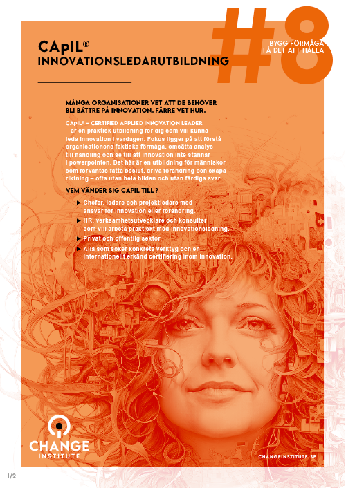 CApIL® är en praktisk utbildning för dig som vill leda innovation i vardagen. Ni får ta del av hela Innovation360:s verktygslåda och ett sammanhållet arbetssätt som kan kopplas till ISO 56000 för tydlighet och uppföljning.