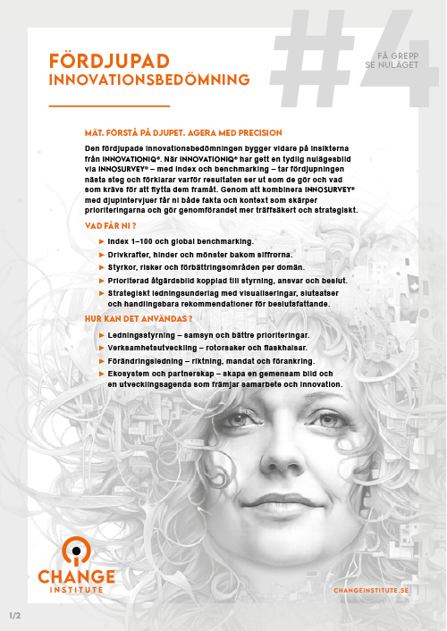 Den fördjupade innovationsbedömningen bygger vidare på InnovationIQ®. InnoSurvey® ger nulägesbild och benchmarking, intervjuerna förklarar varför resultaten ser ut som de gör och vad som krävs för att flytta dem framåt.